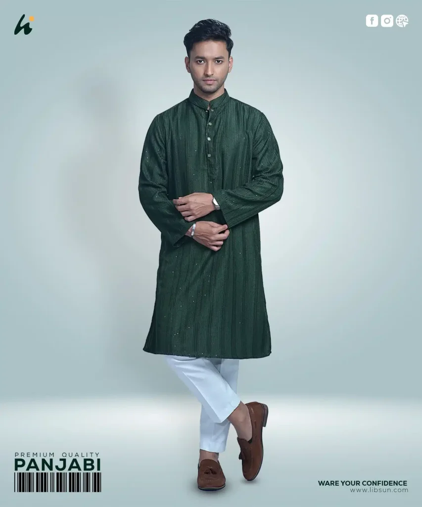 Make a statement with this premium quality green Panjabi from Libsun. Crafted with attention to detail, this elegant attire blends traditional charm with modern sophistication. The textured fabric and subtle embellishments add a touch of class, making it perfect for festive occasions, cultural events, or casual gatherings.